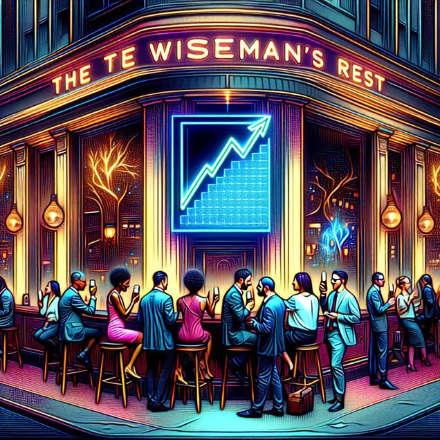 Prompt: Prompt: Create an image of a bustling street with a trendy bar named "Beau's Whiskey Lounge." The bar has a sleek sign indicating the name "Beau" and prominently displaying the logo of Brown-Forman's stock price (BF.B). Inside, young professionals are seen chatting and clinking glasses while checking their smartphones. There is a palpable sense of excitement in the air as they seem to be discussing stocks and naming trends. The scene should embody the essence of surrealism, presenting a dreamlike and visually captivating interpretation of the setting. The depiction should include only scenes, people, and objects, it should not include text or speech bubbles.