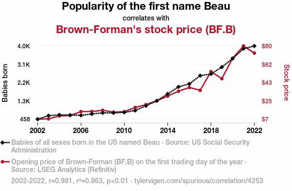 A linear line chart with years as the X-axis and two variables on the Y-axis. The first variable is Popularity of the first name Beau and the second variable is Brown-Forman's stock price (BF.B).  The chart goes from 2002 to 2022, and the two variables track closely in value over that time. Small Image