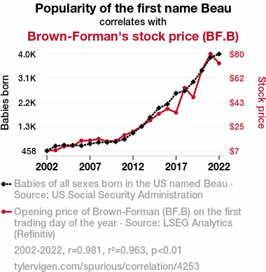 Beau, BF.B, Brown-Forman Corporation, stock price, name popularity, correlation coefficient, p-value, US Social Security Administration, LSEG Analytics, Refinitiv, baby names, stock performance, influence, financial markets, name trends