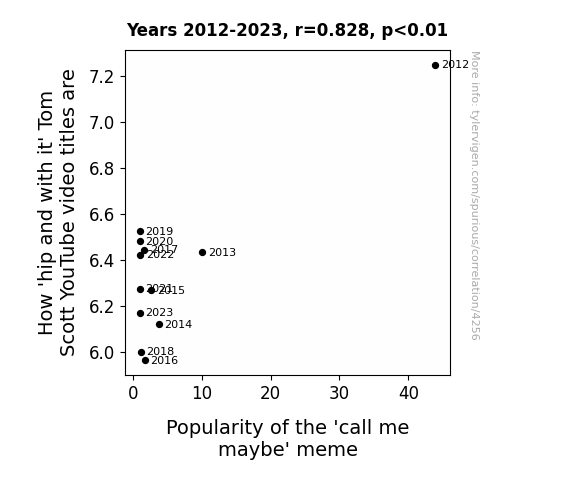 User prompt: Please make up a funny explanation for how a decrease in How 'hip and with it' Tom Scott YouTube video titles are caused Popularity of the 'call me maybe' meme to decrease. Make it feel plausible.