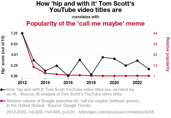 This means 68.5% of the change in the one variable (i.e., Popularity of the 'call me maybe' meme) is predictable based on the change in the other (i.e., How 'hip and with it' Tom Scott's YouTube video titles are) over the 12 years from 2012 through 2023.