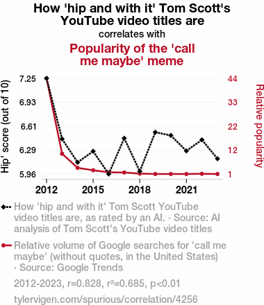 User prompt: Please make up a funny explanation for how a decrease in How 'hip and with it' Tom Scott YouTube video titles are caused Popularity of the 'call me maybe' meme to decrease. Make it feel plausible.