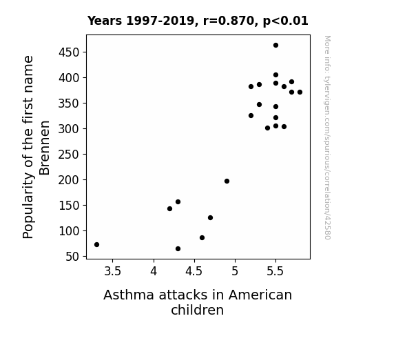 As the popularity of the name Brennen decreased, there were fewer B's in the names of American children. This led to a nationwide reduction in airborne B particles, which in turn lowered the frequency of asthma attacks. It seems that when it comes to respiratory health, every B less is a Breathe easier!Discover a new correlation