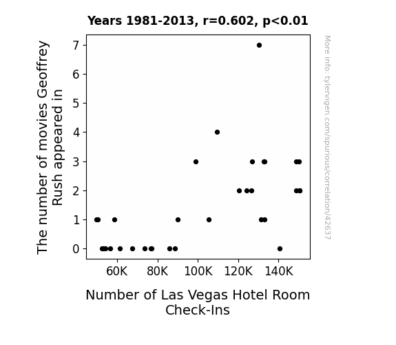This means 36.3% of the change in the one variable (i.e., Number of Las Vegas Hotel Room Check-Ins) is predictable based on the change in the other (i.e., The number of movies Geoffrey Rush appeared in) over the 33 years from 1981 through 2013.