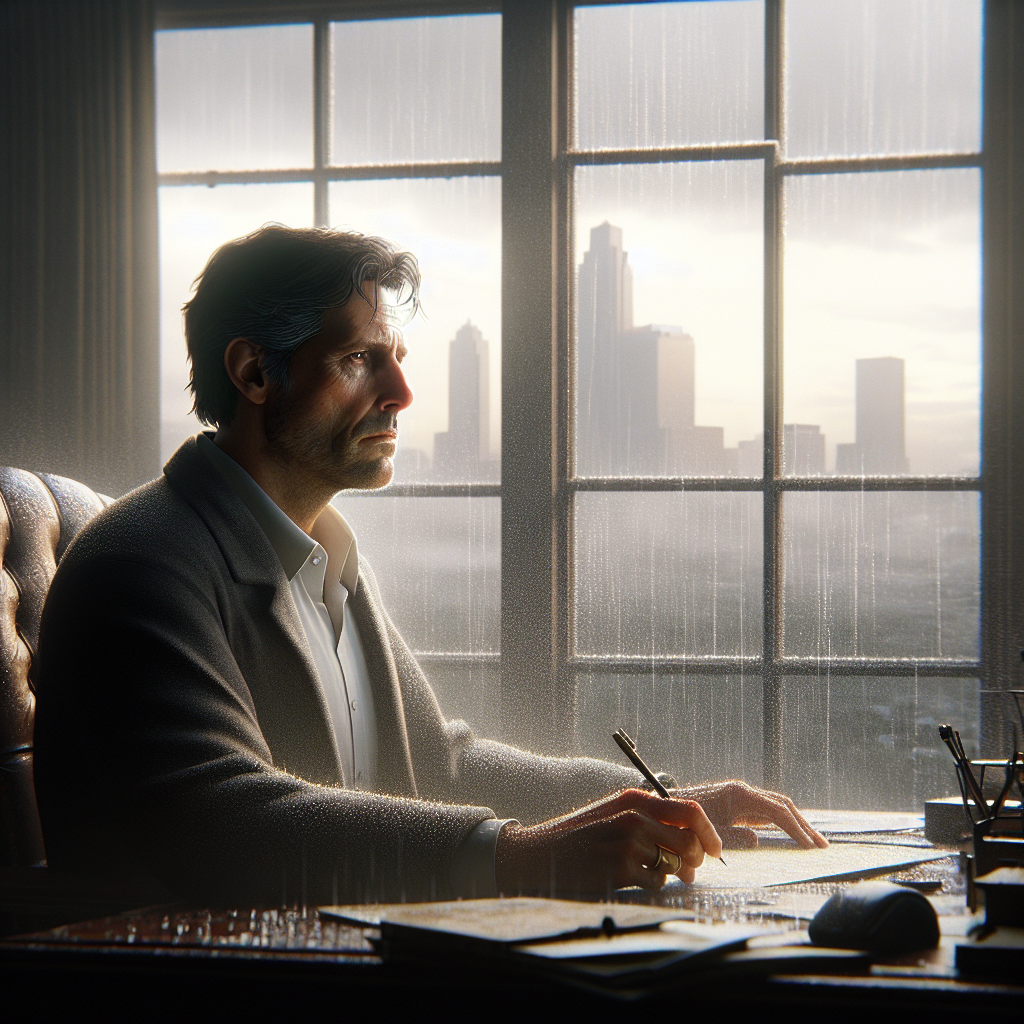 User prompt: Please respond with an image generation prompt that would be likely to create an interesting visual using DALLE-3, using the following style: [ Realistic ] and depicting this scene: Mark Rober sits at his desk, the gentle pitter-patter of rain hitting the window creating a soothing ambiance. As he gazes out at the misty San Antonio skyline, the rhythmic sound of the raindrops seems to awaken his creative senses. The petrichor fills the air, and with each breath, Mark feels a surge of inspiration and insight. With a focused expression, he begins crafting YouTube video titles that are not only captivating but also deeply insightful, each one a testament to the creative power unleashed by the rain. Keep the visual depiction simple. Do not include any words or speech bubbles.