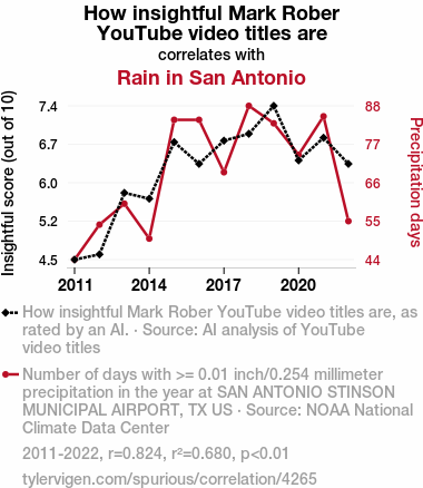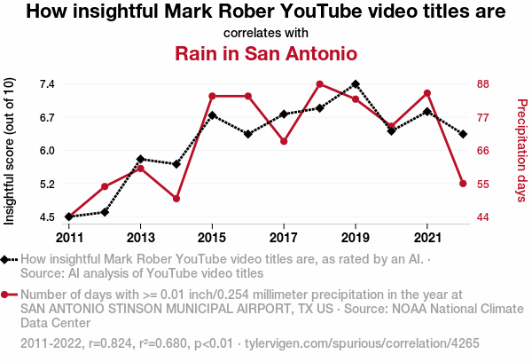 - The spurious research paper: Rain or Shine: Mark Rober's YouTube Titles Forecasting Precipitation in San Antonio