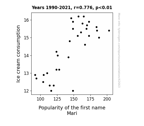 This means 60.2% of the change in the one variable (i.e., Popularity of the first name Mari) is predictable based on the change in the other (i.e., Ice cream consumption) over the 32 years from 1990 through 2021.