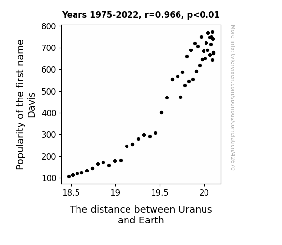 This means 93.4% of the change in the one variable (i.e., The distance between Uranus and Earth) is predictable based on the change in the other (i.e., Popularity of the first name Davis) over the 48 years from 1975 through 2022.
