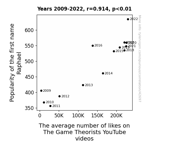 This means 83.6% of the change in the one variable (i.e., The average number of likes on The Game Theorists YouTube videos) is predictable based on the change in the other (i.e., Popularity of the first name Raphael) over the 14 years from 2009 through 2022.