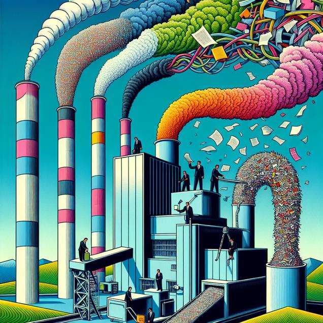 ChatGPT: Prompt: Create an image in the style inspired by bauhaus that depicts a surreal scene of a power plant in Somerset, Kentucky. In the foreground, show legal professionals busily shredding paperwork, with the shredded paper being transported by conveyor belts. The paper is being fed into the power plant's furnace, where it is being combusted, emitting billowing clouds of smoke with colorful, abstract representations of legal jargon and courtroom rhetoric. The power plant is juxtaposed against a vibrant, geometric landscape, alluding to the eco-friendly initiative of using shredded paper as a fuel source.