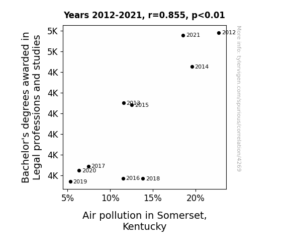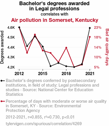 This means 73% of the change in the one variable (i.e., Air pollution in Somerset, Kentucky) is predictable based on the change in the other (i.e., Bachelor's degrees awarded in Legal professions) over the 10 years from 2012 through 2021.