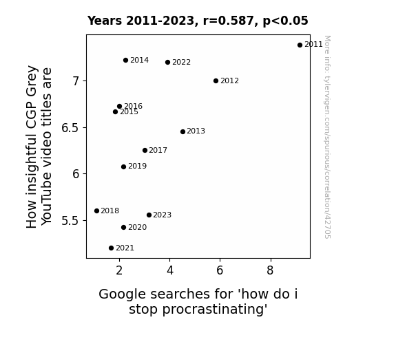 This means 34.5% of the change in the one variable (i.e., Google searches for 'how do i stop procrastinating') is predictable based on the change in the other (i.e., How insightful CGP Grey YouTube video titles are) over the 13 years from 2011 through 2023.