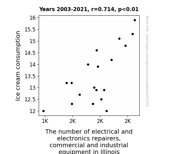 This means 51% of the change in the one variable (i.e., The number of electrical and electronics repairers, commercial and industrial equipment in Illinois) is predictable based on the change in the other (i.e., Ice cream consumption) over the 19 years from 2003 through 2021.