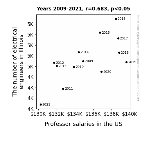This means 46.7% of the change in the one variable (i.e., Professor salaries in the US) is predictable based on the change in the other (i.e., The number of electrical engineers in Illinois) over the 13 years from 2009 through 2021.