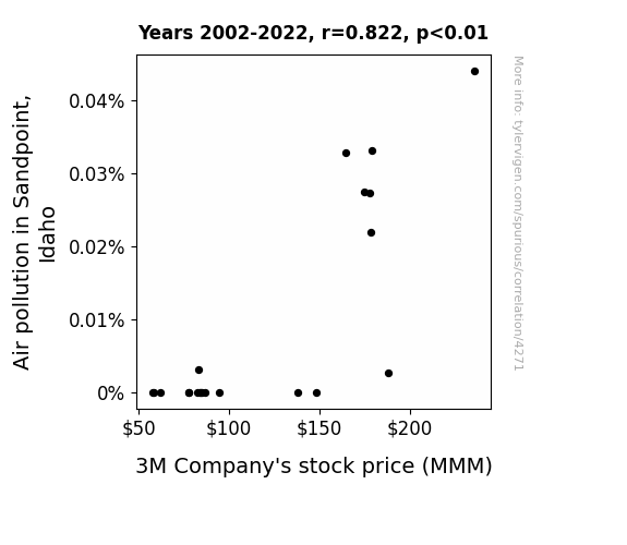 Drawing upon data from the Environmental Protection Agency and LSEG Analytics (Refinitiv), we embarked on a thorough analysis covering the period from 2002 to 2022. Utilizing advanced statistical methods, we uncovered a striking correlation coefficient of 0.8220522 (p < 0.01) between air pollution levels in Sandpoint and the stock prices of 3M Company. It seems that the air might be whispering secrets to us, though we're not entirely sure what it's saying just yet - hopefully not just "breathe easy"!