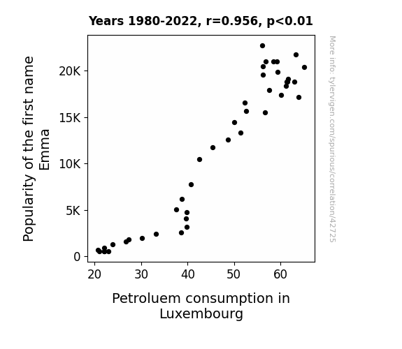 This means 91.4% of the change in the one variable (i.e., Petroluem consumption in Luxembourg) is predictable based on the change in the other (i.e., Popularity of the first name Emma) over the 43 years from 1980 through 2022.