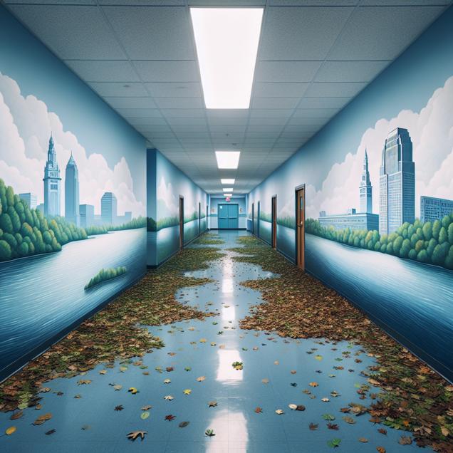 ChatGPT: [ Symbolism ] Create an image of a serene classroom corridor in Cleveland, where the floors are lined with fallen leaves in various shades of blue and green. The corridor's walls are adorned with murals of peaceful, flowing rivers, symbolizing the diminishing stress levels of the city. Show the hallways fading into a peaceful, misty horizon that merges with the skyline of Cleveland, now free from the haze of pollution.