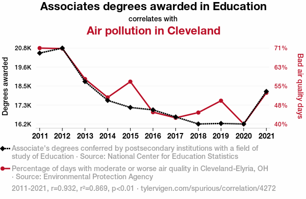 Associates degrees in Education, air pollution, Cleveland, correlation, National Center for Education Statistics, Environmental Protection Agency, educational pursuits, environmental factors, academia, research, unexpected correlations