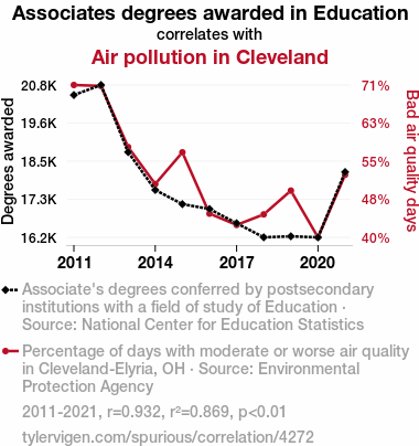 - The spurious research paper: Breath of Fresh Careers: The Link Between Associates Degrees in Education and Air Pollution in Cleveland