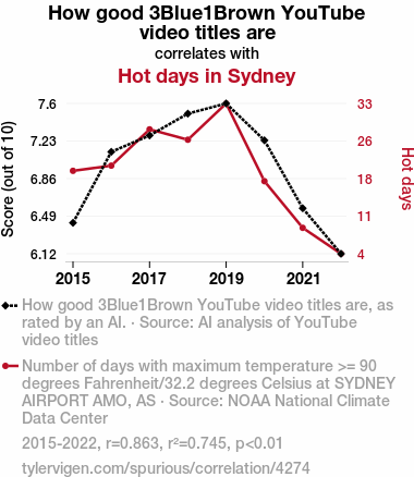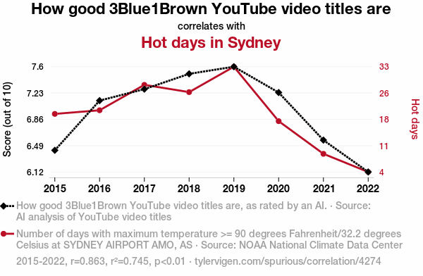 - The spurious research paper: Shedding Light on Summertime Subscriptions: The Surprising Relationship Between 3Blue1Brown YouTube Video Titles and Sydney's Sizzle