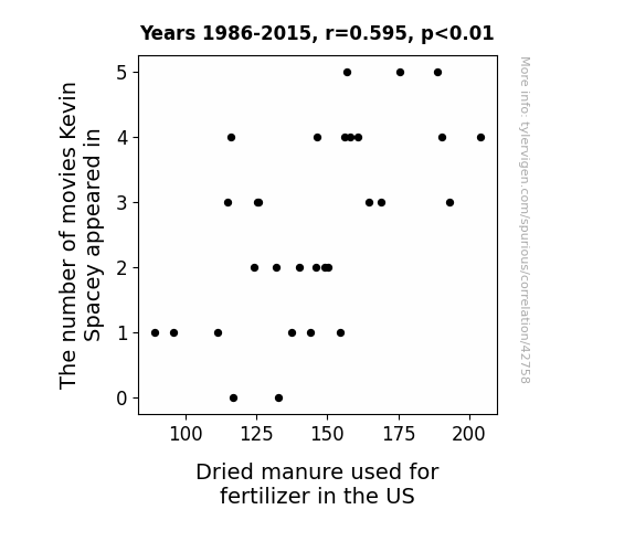 This means 35.5% of the change in the one variable (i.e., Dried manure used for fertilizer in the US) is predictable based on the change in the other (i.e., The number of movies Kevin Spacey appeared in) over the 30 years from 1986 through 2015.