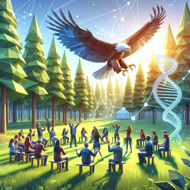 ChatGPT: Generate an image of a low-poly landscape that showcases a group of LARPers enthusiastically enacting biogenetic-themed scenarios in a lush forest clearing in Harrison, Arkansas. The scene should be set under a clear sky, with the participants immersed in portraying DNA strands and mimicking cellular processes. The atmosphere of the forest should be fresh and vibrant, reflecting the participants' energy and determination. Additionally, incorporate a subtle representation of the unexpected uptick in Biogen's stock price, reflecting the growing enthusiasm for biogenetic-themed LARPing.