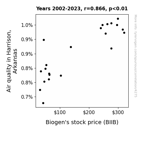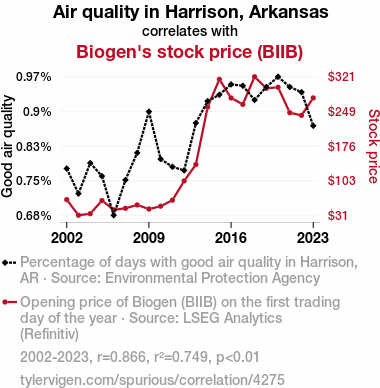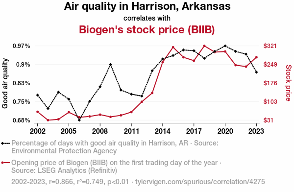 - The spurious research paper: Clearing the Air: Exploring the Gasping Correlation Between Air Quality in Harrison, Arkansas, and Biogen's Stock Price