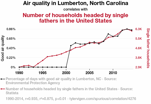 This means 87.5% of the change in the one variable (i.e., Number of households headed by single fathers in the United States) is predictable based on the change in the other (i.e., Air quality in Lumberton, North Carolina) over the 25 years from 1990 through 2014.