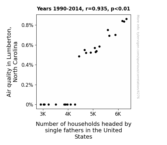 The correlation coefficient of 0.9352401 between our two variables was stronger than a coffee after an all-nighter – it practically jumped off the spreadsheet, waving a neon sign saying "Look at me, I'm significant!" This coefficient's solid grip on the relationship between air quality and single father households left us breathless, and not just from the atmospheric conditions in Lumberton.