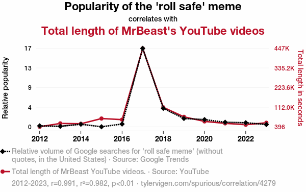 'roll safe' meme, MrBeast YouTube videos, internet memes correlation, YouTube content creation, Google Trends data analysis, YouTube analytics, statistical analysis, internet culture dynamics
