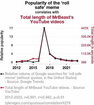 User prompt: Please provide potential search keywords for a paper titled Rolling into Virality: The Surprising Link Between the 'Roll Safe' Meme and the Length of MrBeast YouTube Videos with an abstract of In this paper, we delve into the unexpectedly interconnected worlds of internet memes and YouTube content creation. We scrutinize the correlation between the prevalence of the 'roll safe' meme and the total duration of MrBeast's videos, aiming to unravel this curious relationship. Utilizing data from Google Trends and YouTube analytics, we meticulously conducted a statistical analysis over the period from 2012 to 2023. The results astoundingly revealed a correlation coefficient of 0.9910591, with p < 0.01, showcasing a remarkably strong association between the two variables. Our findings leave us rolling with laughter as we uncover the hilariously unexpected ties between online memes and digital content formats, shedding light on the quirky dynamics of internet culture.