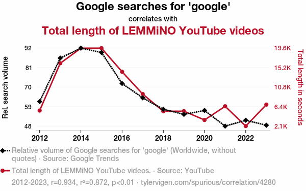 User prompt: Please provide potential search keywords for a paper titled Gauging the Groovy Google Gander: Grasping the Gravitational Gist of Google Searches and LEMMiNO's Lengthy YouTube Labyrinth with an abstract of The present study delves into the intriguing relationship between the frequency of Google searches for the term 'google' and the cumulative duration of LEMMiNO's enthralling YouTube videos. The investigation utilized data extracted from Google Trends and YouTube over the time span from 2012 to 2023. The correlation analysis revealed a remarkably robust coefficient of 0.9338793 with a significance level of p < 0.01, elucidating a striking, if somewhat confounding, connection between these ostensibly disparate entities. Through a statistically rigorous approach, we arrived at a revelatory nexus between the eponymous search engine and the captivating content produced by LEMMiNO. This paper not only fulfills scientific inquiry but also caters to the innate curiosity of aficionados of data analytics and YouTube content alike. Anecdotal evidence suggests that the researchers may have embarked on a journey akin to exploring the uncharted territories of the World Wide Web, discovering unexpected correlations and connections in the digital domain.