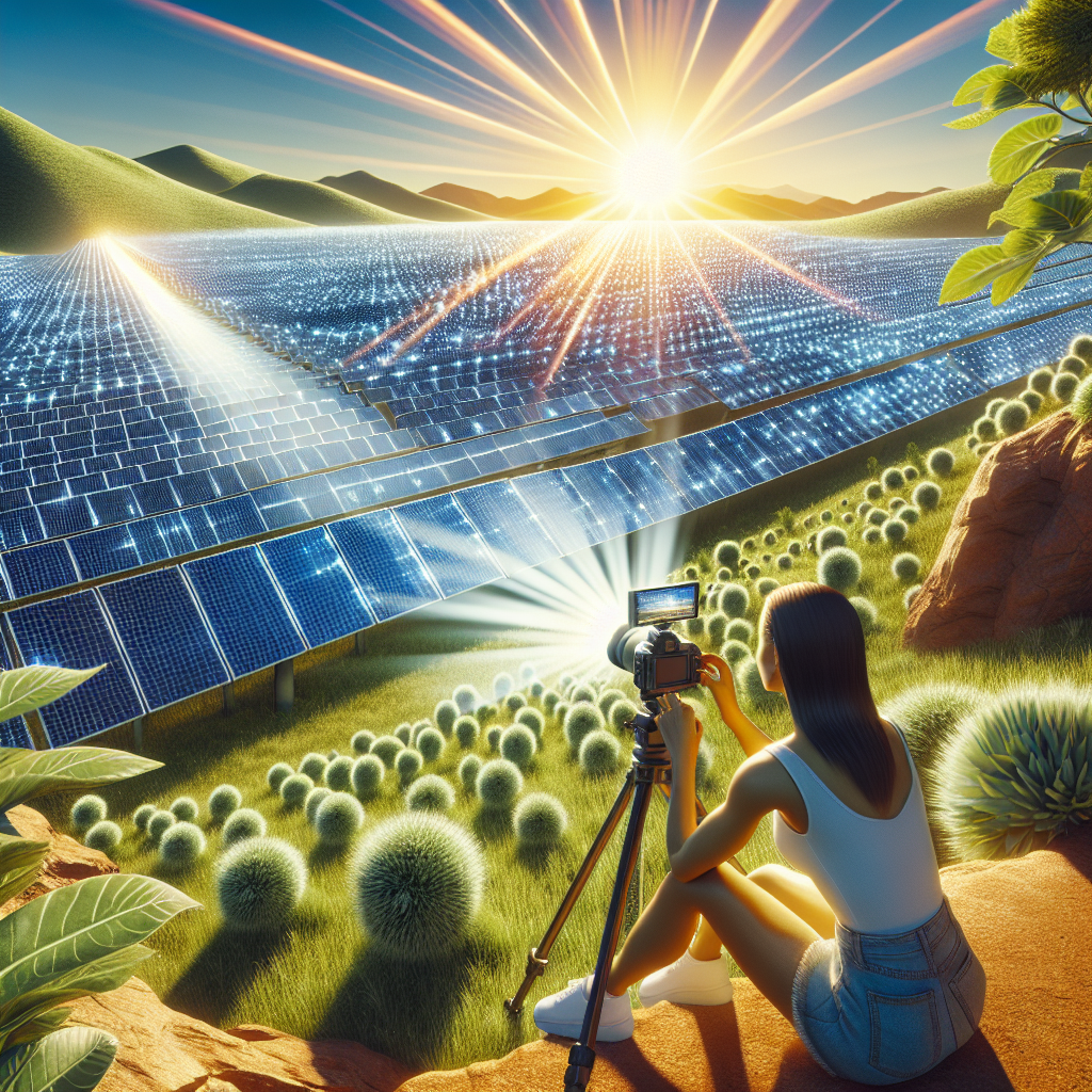 Prompt: "Generate an image of a cybernetic landscape set in Bolivia featuring a vast solar power plant basking in the intense sunlight. Rows of solar panels glisten in the radiant glow, while nearby, a content creator sits among lush greenery. The creator is shooting a video that seemingly stretches on for eternity, taking advantage of the extended daylight hours to craft an excessively detailed and over-explained YouTube video. The vibrant energy of the sun appears to fuel both the solar panels and the creator's creativity, resulting in an abundance of solar power and a lengthy digital creation." The depiction should include only scenes, people, and objects, it should not include text or speech bubbles.