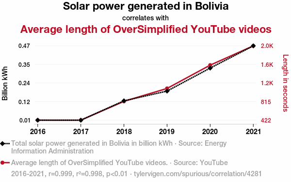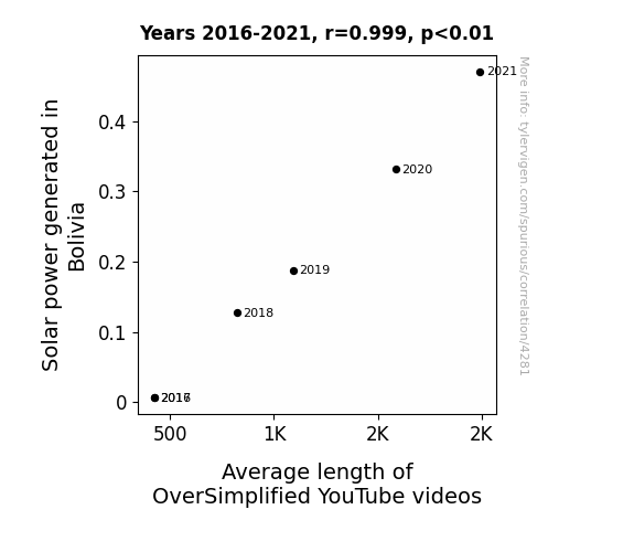 This means 99.8% of the change in the one variable (i.e., Average length of OverSimplified YouTube videos) is predictable based on the change in the other (i.e., Solar power generated in Bolivia) over the 6 years from 2016 through 2021.