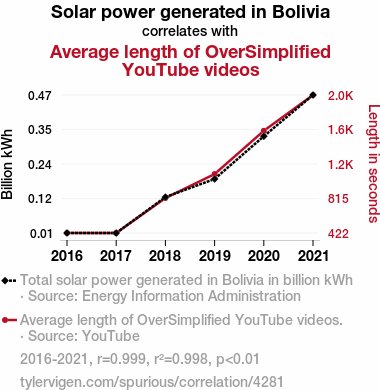 User prompt: Please provide potential search keywords for a paper titled Shining a Light on Solar Power: A Sunny Connection to the Length of OverSimplified YouTube Videos with an abstract of This study sheds light on the illuminating correlation between the solar power generated in Bolivia and the average length of OverSimplified YouTube videos. Utilizing data from the Energy Information Administration and YouTube, our research team conducted a comprehensive analysis spanning from 2016 to 2021. The findings reveal a remarkably high correlation coefficient of 0.9988460 and p < 0.01, indicating a strong link between these seemingly disparate variables. Our results suggest that as solar power production in Bolivia increased, the average length of OverSimplified YouTube videos also exhibited a corresponding rise, illuminating a captivating connection. These findings not only spotlight the influence of renewable energy on digital content creation but also bring a new meaning to the term "solar-powered entertainment.