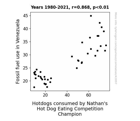 This means 75.3% of the change in the one variable (i.e., Hotdogs consumed by Nathan's Hot Dog Eating Competition Champion) is predictable based on the change in the other (i.e., Fossil fuel use in Venezuela) over the 42 years from 1980 through 2021.