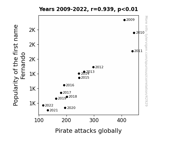 This means 88.2% of the change in the one variable (i.e., Pirate attacks globally) is predictable based on the change in the other (i.e., Popularity of the first name Fernando) over the 14 years from 2009 through 2022.