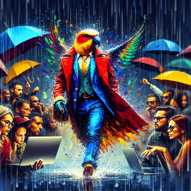 ChatGPT: Generate an image of a vibrant YouTube video thumbnail showcasing a confident and stylish bird wearing a colorful raincoat. The bird is strutting among a shower of raindrops, exuding an air of elegance. In the background, create a group of people huddled around a laptop, eagerly searching for quirky queries such as "do birds use umbrellas" and "bird raincoats." Meanwhile, a once-prominent Google search for "where do birds go when it rains" should be fading into the background, symbolizing its diminishing trendiness. Ensure that the scene is visually captivating and conveys the excitement of discovery and quirky fascination with avian behavior.