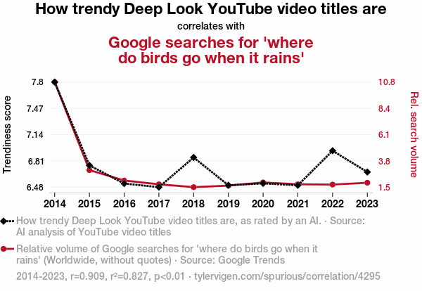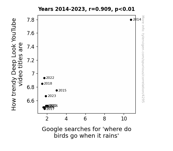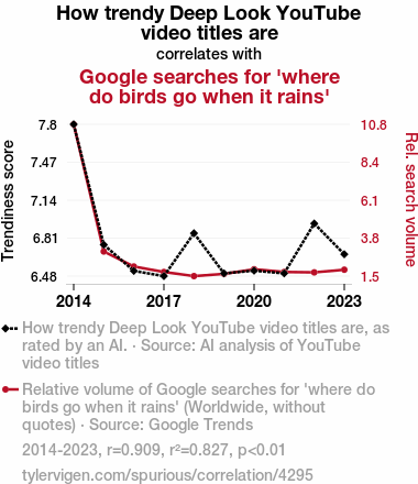 This means 82.7% of the change in the one variable (i.e., Google searches for 'where do birds go when it rains') is predictable based on the change in the other (i.e., How trendy Deep Look YouTube video titles are) over the 10 years from 2014 through 2023.