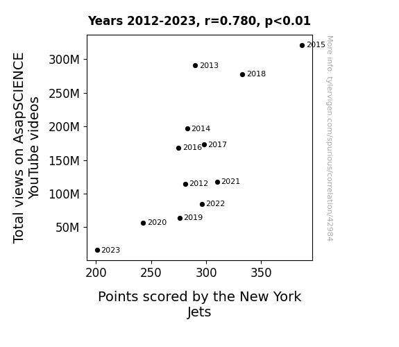 This means 60.9% of the change in the one variable (i.e., Points scored by the New York Jets) is predictable based on the change in the other (i.e., Total views on AsapSCIENCE YouTube videos) over the 12 years from 2012 through 2023.