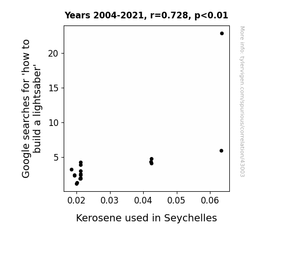 This means 52.9% of the change in the one variable (i.e., Kerosene used in Seychelles) is predictable based on the change in the other (i.e., Google searches for 'how to build a lightsaber') over the 18 years from 2004 through 2021.
