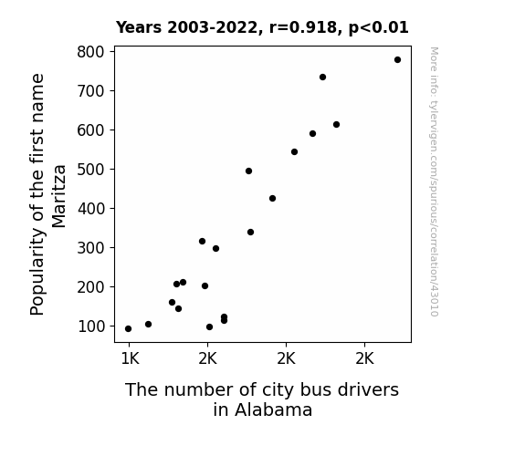 This means 84.3% of the change in the one variable (i.e., The number of city bus drivers in Alabama) is predictable based on the change in the other (i.e., Popularity of the first name Maritza) over the 20 years from 2003 through 2022.