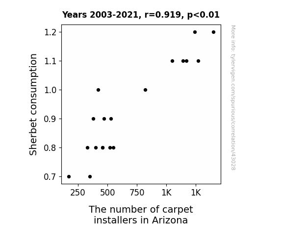 This means 84.5% of the change in the one variable (i.e., The number of carpet installers in Arizona) is predictable based on the change in the other (i.e., Sherbet consumption) over the 19 years from 2003 through 2021.