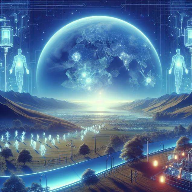 Prompt: Generate an image of a futuristic cybernetic landscape with a serene farmland in the foreground. Two high-tech gas pumps stand prominently in the center, emitting a faint blue light. The surrounding atmosphere is filled with subtle futuristic elements and technology, indicating the interconnectedness of the world. A digital representation of the jet stream hangs overhead, with faint ripples appearing due to the collective sighs of the people. Overlaid on the scene are translucent outlines of people casting their votes, symbolizing the impact of individual choices on a global scale. The image captures the interconnectedness of the world, linking the seemingly disparate events in Arkansas and Germany. The depiction should include only scenes, people, and objects, it should not include text or speech bubbles.