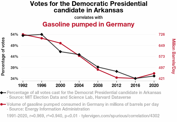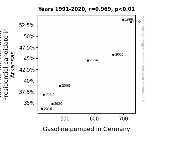 This means 94% of the change in the one variable (i.e., Gasoline pumped in Germany) is predictable based on the change in the other (i.e., Votes for the Democratic Presidential candidate in Arkansas) over the 8 years from 1991 through 2020.