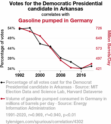 - The spurious research paper: Fueling the Vote: A Surprising Correlation Between Democrat Votes in Arkansas and Gasoline Consumption in Germany