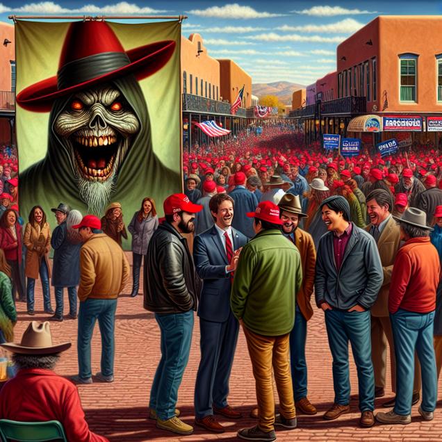 Prompt: [ A photo-realistic image ] In the middle of a lively town square in New Mexico, a large banner proudly displays the name "Samara" in bold letters. Passersby gather around, some nodding in recognition, while others excitedly engage in conversation. Amidst the bustling scene, a group of voters clad in red "Make America Great Again" hats begins to form a line, adding to the vibrant energy. Meanwhile, a popular horror movie character from "The Ring" is depicted next to the name, adding a chilling presence to the atmosphere. In the background, enthusiastic supporters cheer for the Republican Presidential candidate, creating an atmosphere of fervent enthusiasm as they promise to bring a "ring" of positive change to the country. The depiction should include only scenes, people, and objects, it should not include text or speech bubbles.