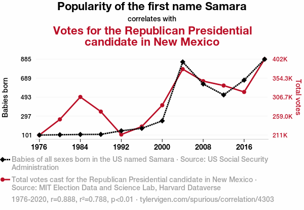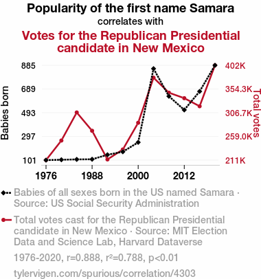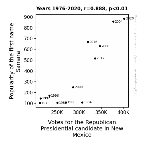 Fig. 1 illustrates the striking correlation, plotting the increasing popularity of the first name "Samara" against the rising votes for the Republican presidential candidate in New Mexico. The scatterplot graphically conveys the compelling association between the two variables. It's clear that "Samara-nity" may be more than just a play on words!