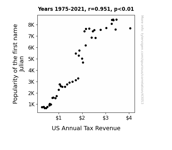 This means 90.5% of the change in the one variable (i.e., US Annual Tax Revenue) is predictable based on the change in the other (i.e., Popularity of the first name Julian) over the 47 years from 1975 through 2021.