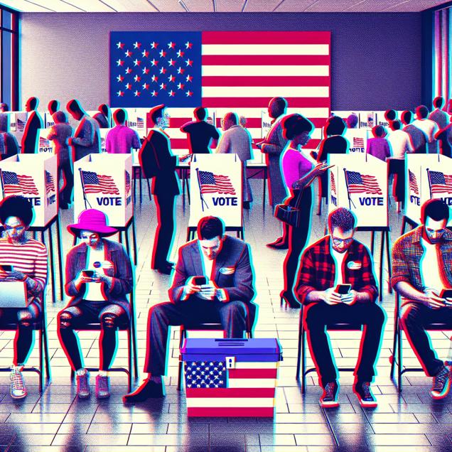 User prompt: Please respond with an image generation prompt that would be likely to create an interesting visual using DALLE-3, using the following style: [ Glitch art ] and depicting this scene: A group of Republican voters in Louisiana casting their ballots at a polling station while simultaneously searching "how to hide a body" on their phones, creating an odd juxtaposition as they exercise their political rights and perhaps taking their election fervor to an extreme level. Keep the visual depiction simple. Do not include any words or speech bubbles.